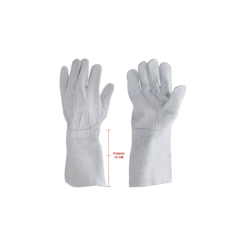 Luva de segurança confeccionada em Raspa curtida ao cromo, com tira de reforço entre os dedos polegar e indicador, com reforço interno na palma e dedos.