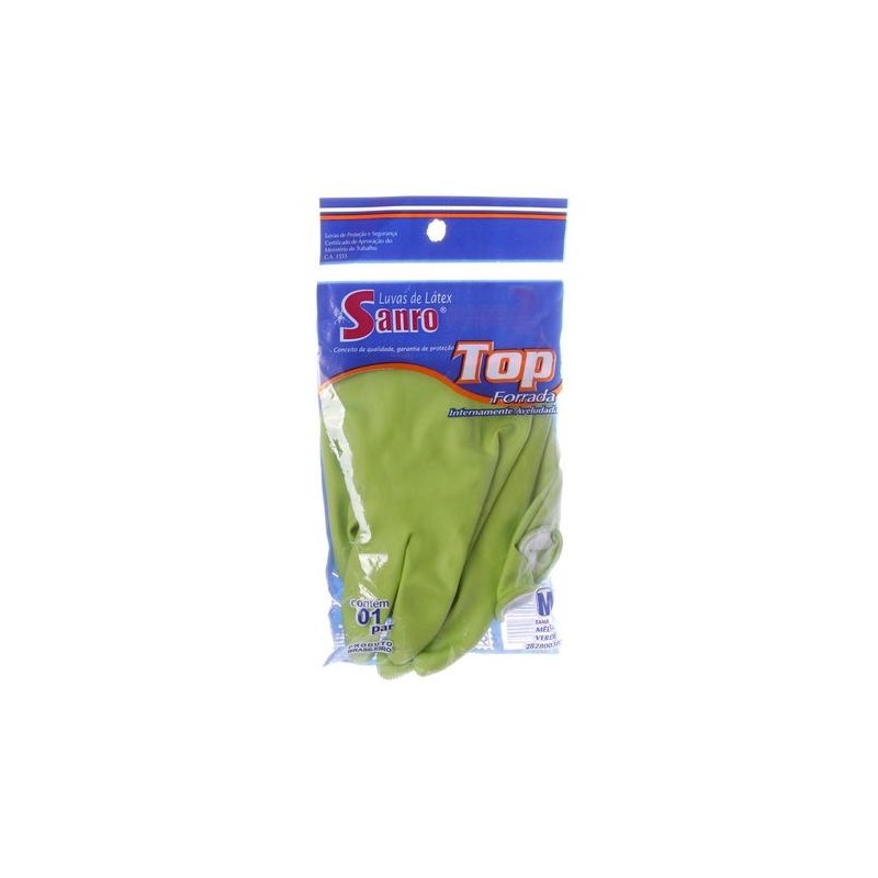Luva de Látex Emborrachada Verde Tamnho M Sanro, elaboradas com látex de borracha natural de alta qualidade, as luvas Sanro Top conferem proteção às mãos dos usuários, preferencialmente para tarefas mais pesadas, que exigem maior segurança. São internamente forradas com flocos de algodão, proporcionam grande conforto e ótima maleabilidade. São antiderrapantes, têm um ótimo calçamento e dispensam o uso de talco.