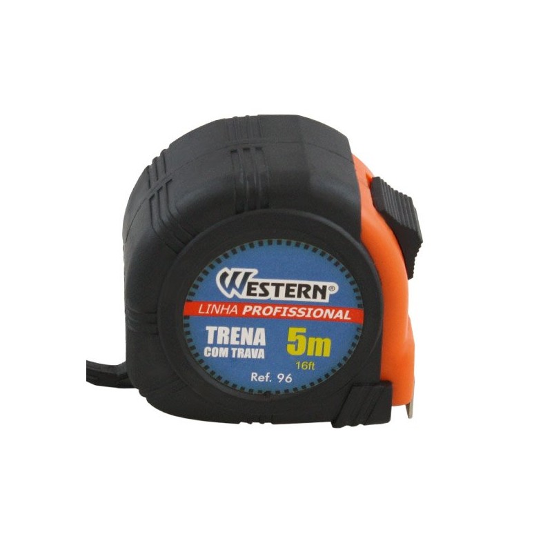 • Trena com trava profissional pro. • Com imã. • Corpo emborrachado. • A prova de choque. • Com alça. • Fita larga: 5m x 25mm.